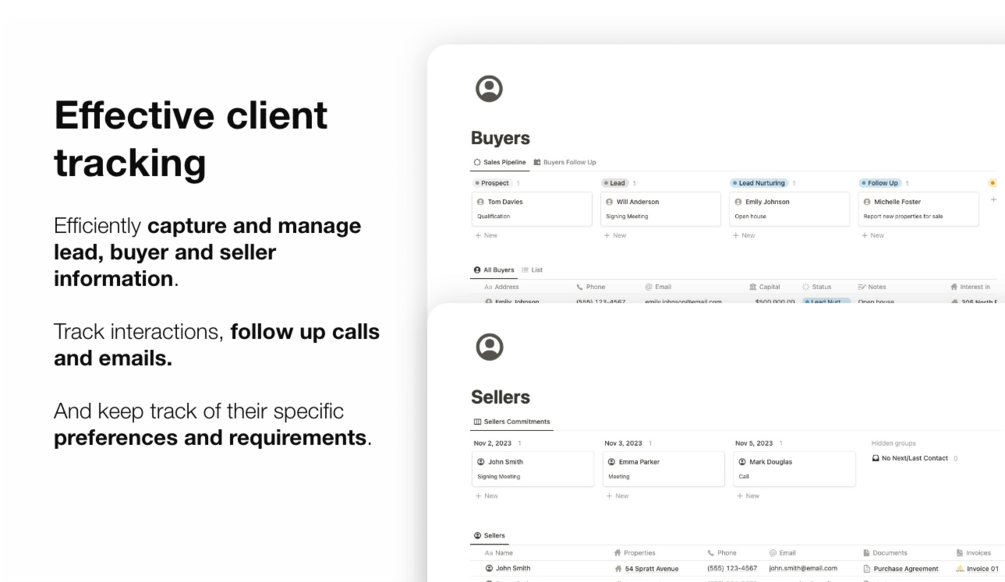 - Client Management (Buyers & Sellers): Keep track of your clients, record their contact information, preferences and needs. Record interactions for personalized service.