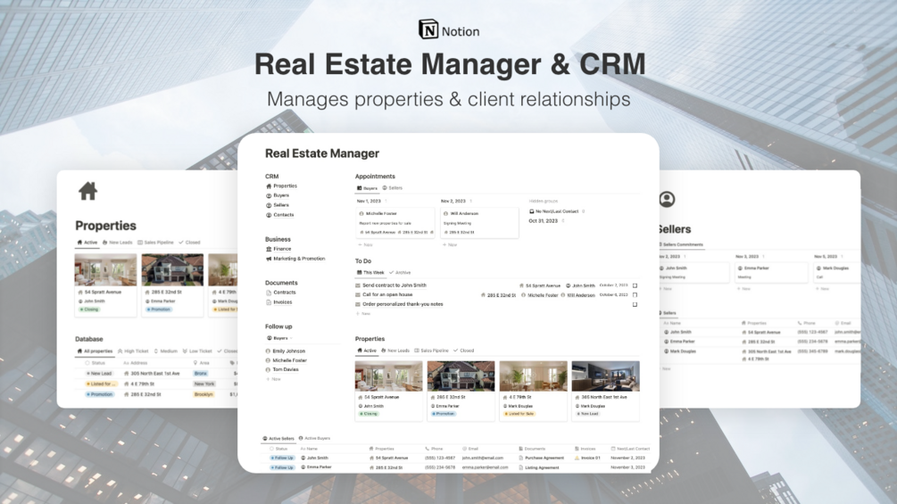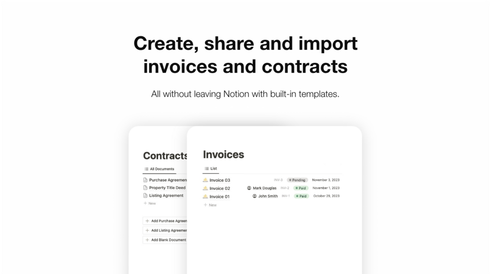 - Efficient Document Management: Easily access important documents and standard templates, such as contracts and property presentations. Create and export them from Notion