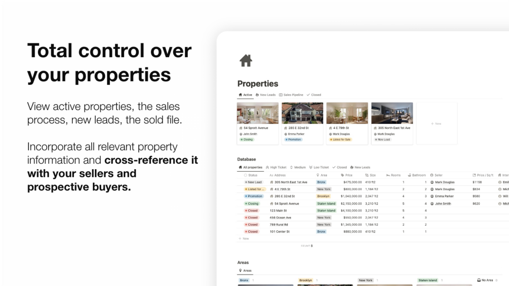 - Property Management: Records and organizes property details, from addresses to images and relevant documents. Filter and tag properties for quick search and cross-reference with buyers' needs.
